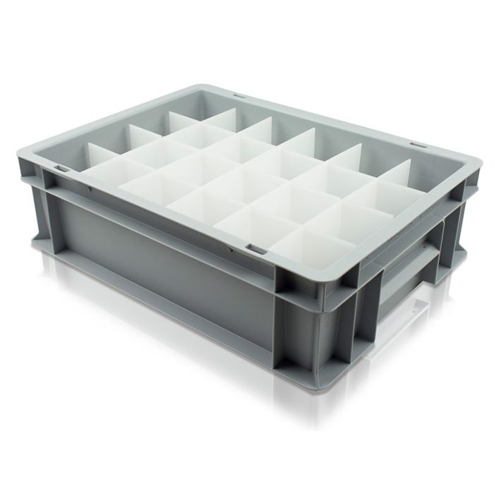The Stackable Euro Box with dividers inserts is part of our half size glassware storage containers range (400x300mm). Boxes come with protective chemical / heat resistant divider inserts. Caterbox's half size glassware boxes a perfect for storing glassware and other small items like engineering components. The solid euro container is not only strong & durable, but fully stackable & lightweight too - great for maximising and optimising your storage space with ease and efficiency. The box divider inserts are easily removed, making way for a multi-functional storage solution. The digitally cut dividers provide optimal protection for your glassware, reducing breakages and saving you money.